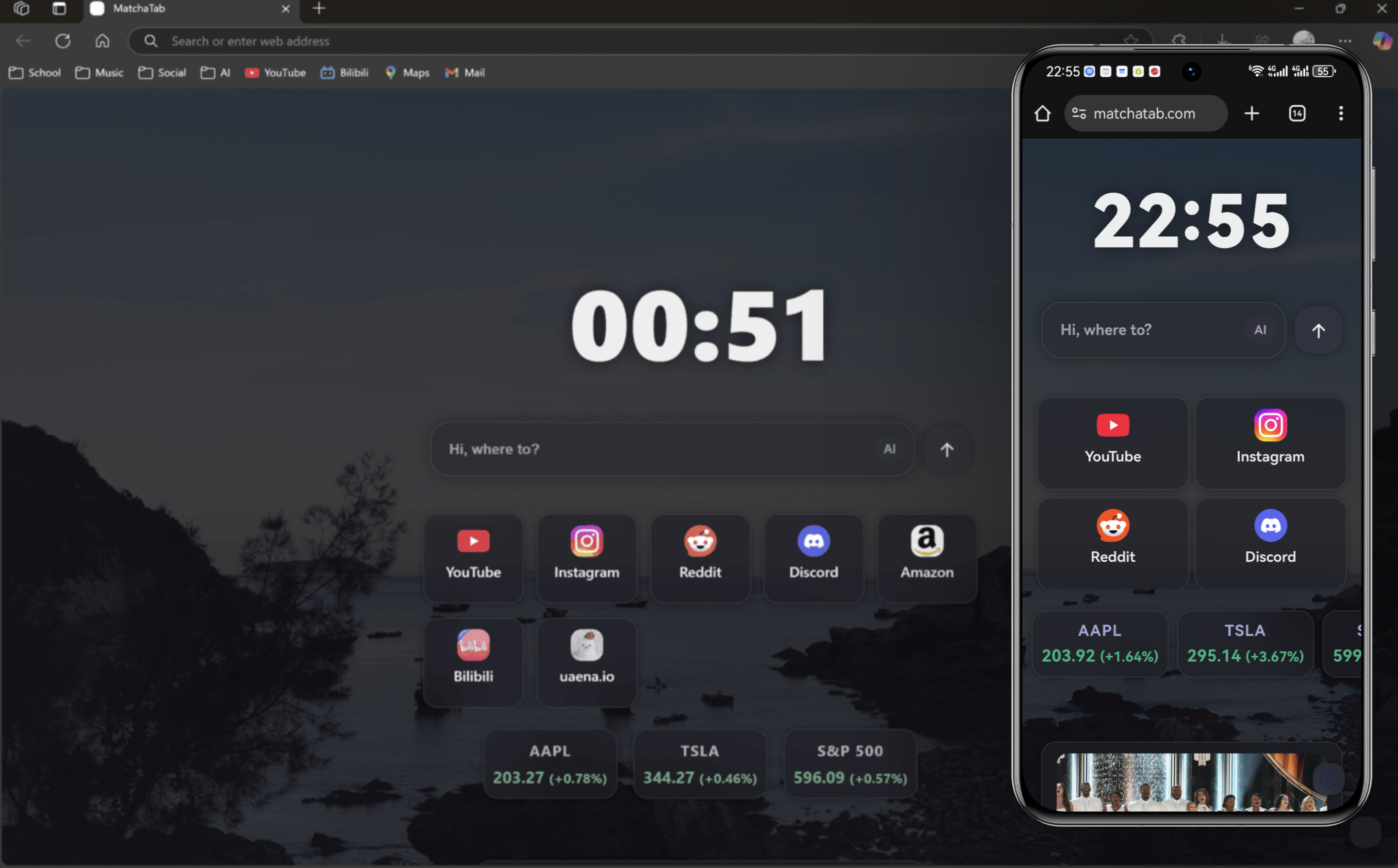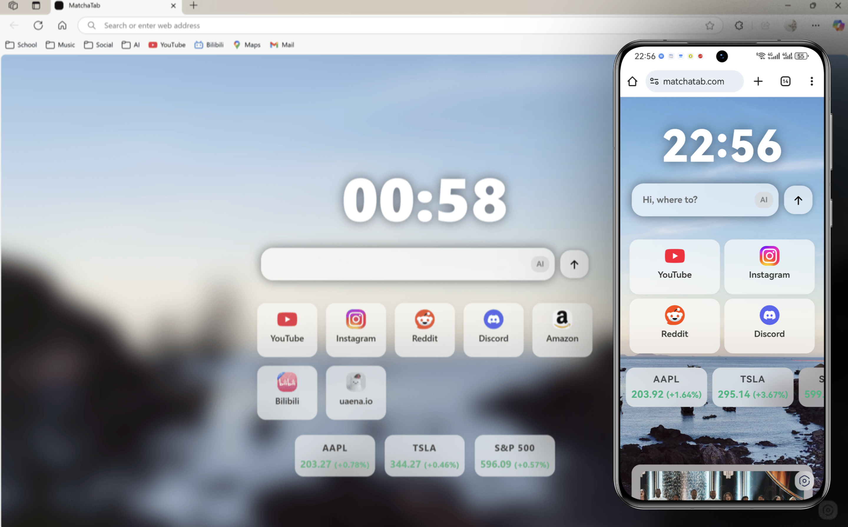 MatchaTab is a browser new tab homepage featuring a modern acrylic design. It provides real-time stock information, news, customizable quick links, direct ChatGPT search, and the ability to change your wallpaper. The layout is fully responsive, ensuring a seamless experience on any screen size. Currently, Bing is the only supported search engine. MatchaTab is still in alpha, and more features will be added soon.